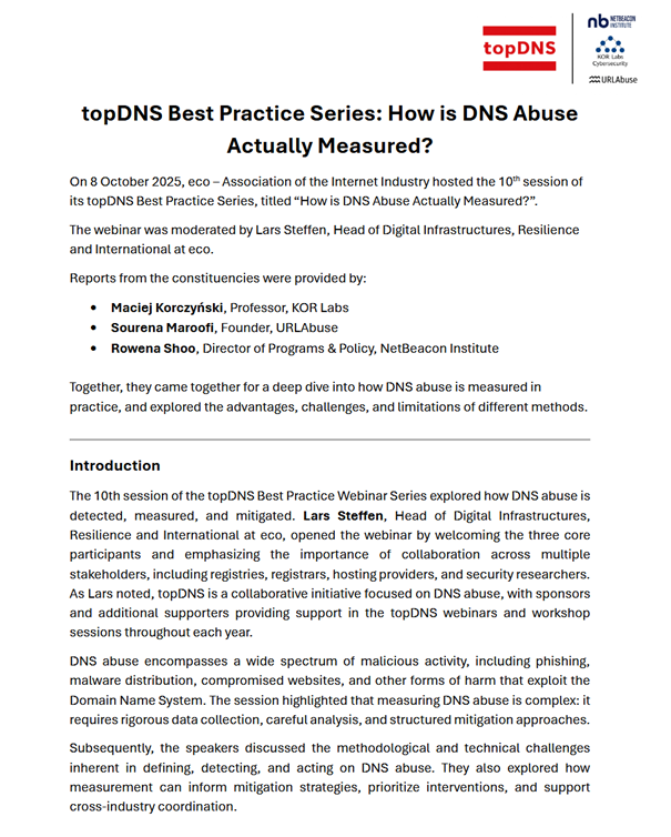eco’s topDNS Initiative, in cooperation with KOR Labs, NetBeacon Institute, and URLAbuse, hosted the tenth in a series of topDNS Best Practice webinars, exploring how DNS abuse is actually measured and what that means for improving mitigation across the domain industry. The session brought together experts Prof. Maciej Korczynski (KOR…